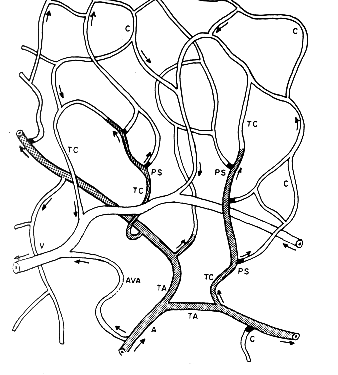 The above graphic illustrates the major components of the microcirculation. V is a venule, a an arteriole, c a capillary, ps the precapillary sphincters and ava an arterial-venous anastomosis (i.e., a shunt). The precapillary sphincters are modulated by the sympathetic nervous system.